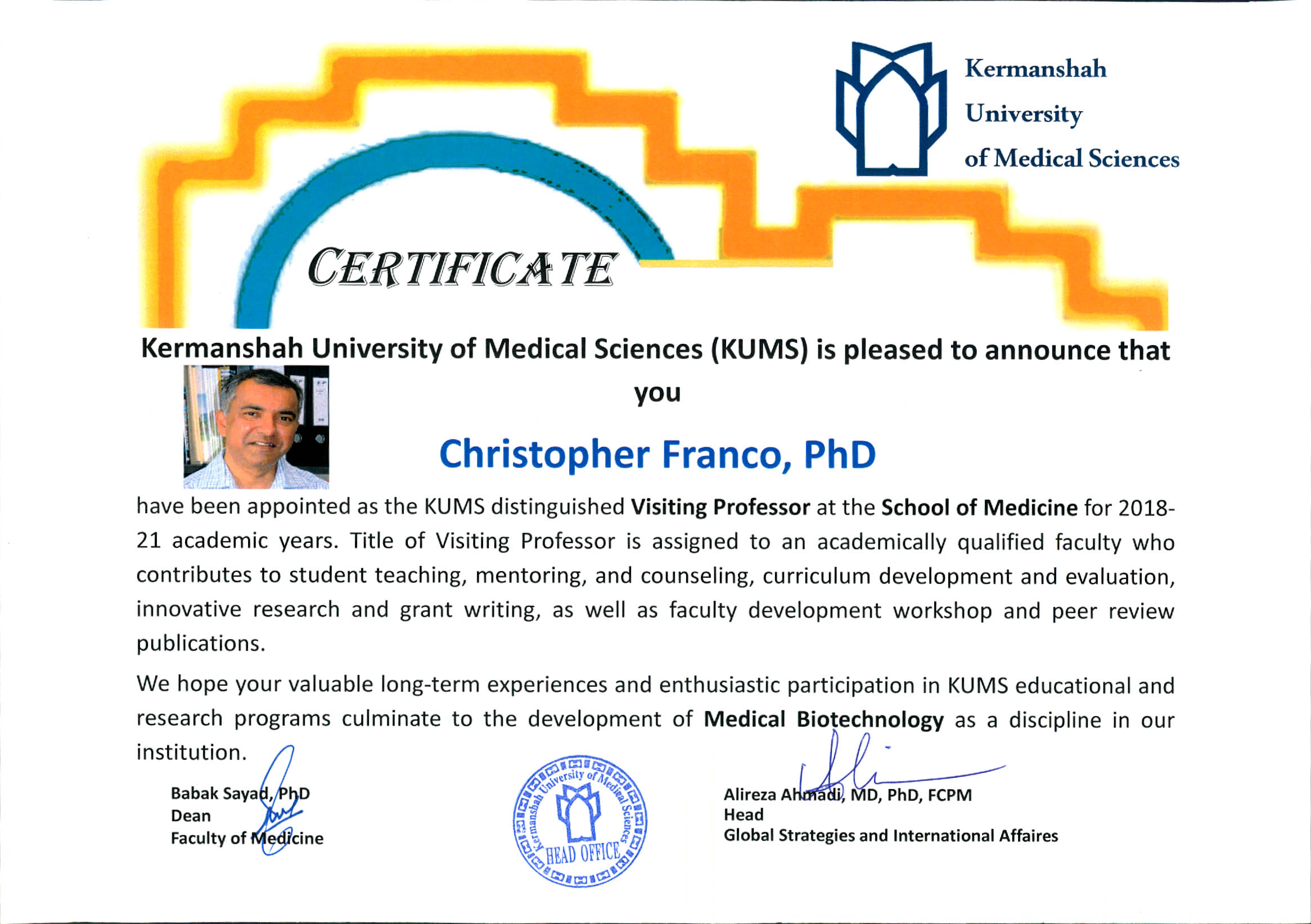 Professor Christopher Franco's research career combines both the industrial and academic spheres. For 10 years he lead a successful drug discovery and development group in an International biopharmaceutical company and holds patents for 11 compound families. In 1993, he joined the School of Medicine, as a founding academic in the Biotechnology Program. Now Head, Medical Biotechnology, he manages the Biotechnology teaching and research programs in the School of Medicine. He is Australia's leading actinobacteriologist and continues to discover novel actinobacteria and new bioactives from algae, plant cell culture, mammalian cells and marine organisms. He pioneered the isolation and application of actinobacterial endopytes for sustainable crop production and leads GRDC's multi-insitutional Benificial Microbes Project.