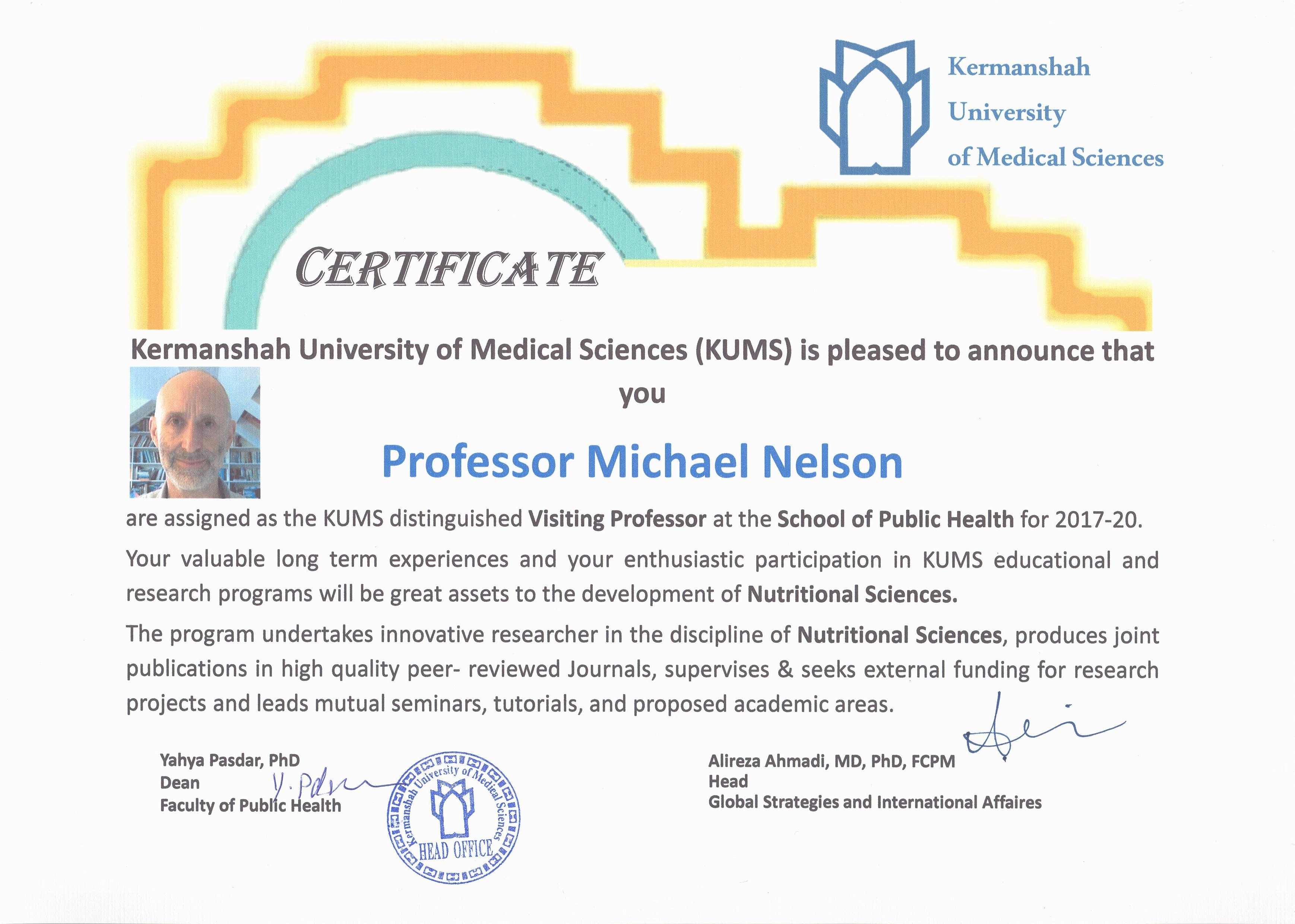 ProfileCertificate Michael Nelson Visiting Professor Phone: Organizational affiliation: +41613255134 E-mail: Department: Michael.nelson@phnresearch.org.uk Nutritional Sciences Certificate Paper