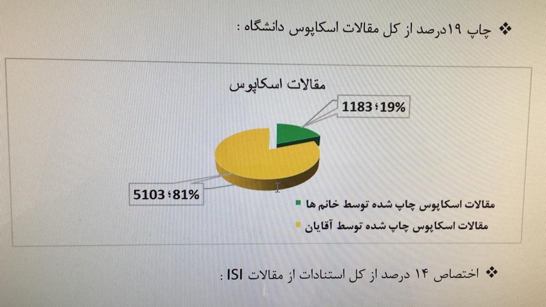 این مسئول به سهم 19 درصدی زنان از تولید مقالات اسکاپوس دانشگاه نیز اشاره کرد و افزود: از مجموع 5103 مقاله اسکاپوس تولیدی دانشگاه، 1183 مقاله توسط زنان به چاپ رسیده است.
