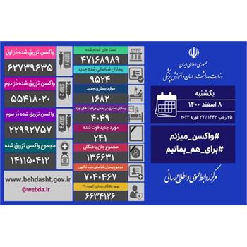 تا کنون ۶۲ میلیون و ۷۳۹ هزار و ۶۳۵ نفر دُز اول، ۵۵ میلیون و ۴۱۸ هزار و ۲۰ نفر دُز دوم و ۲۲ میلیون و ۹۹۲ هزار و ۷۵۷ نفر، دُز سوم واکسن کرونا را تزریق کرده اند و مجموع واکسن های تزریق شده در کشور به ۱۴۱ میلیون و ۱۵۰ هزار و ۴۱۲ دُز رسید.