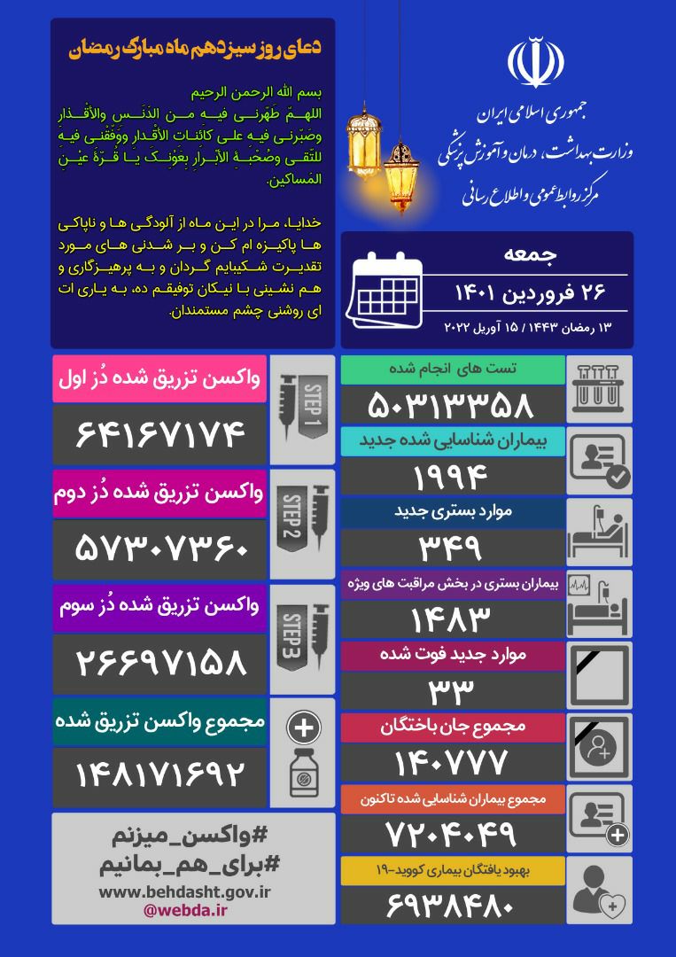 از دیروز تا امروز ۲۶ فروردین ماه ۱۴۰۱ و بر اساس معیارهای قطعی تشخیصی، یک هزار و ۹۹۴ بیمار جدید مبتلا به کووید۱۹ در کشور شناسایی شد که ۳۴۹ نفر از آنها بستری شدند.