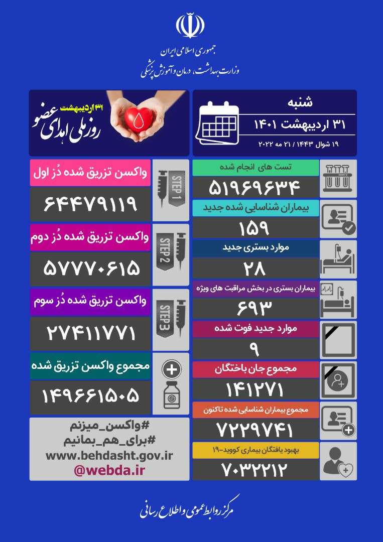 از دیروز تا امروز ۳۱ اردیبهشت ماه ۱۴۰۱ و بر اساس معیارهای قطعی تشخیصی، ۱۵۹ بیمار جدید مبتلا به کووید۱۹ در کشور شناسایی و ۲۸ نفر از آنها بستری شدند.