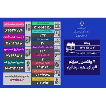از 2تیرماه تا ۳ تیرماه ۱۴۰۱ و بر اساس معیارهای قطعی تشخیصی، ۲۳۲ بیمار جدید مبتلا به کووید۱۹ در کشور شناسایی و ۳۰ نفر از آنها بستری شدند.