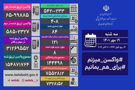 متاسفانه در طول ۲۴ ساعت گذشته، ۸ بیمار مبتلا به کووید۱۹ در کشور جان خود را از دست دادند و مجموع جان باختگان این بیماری، به ۱۴۴ هزار و ۴۹۸ نفر رسید.