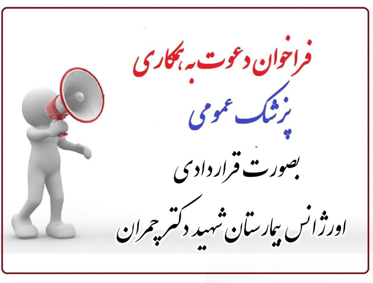 بیمارستان شهید دکتر چمران شهرستان کنگاور در نظر دارد نسبت به جذب تعدادی از همکاران پزشک عمومی بصورت قرار دادی اقدام نماید .