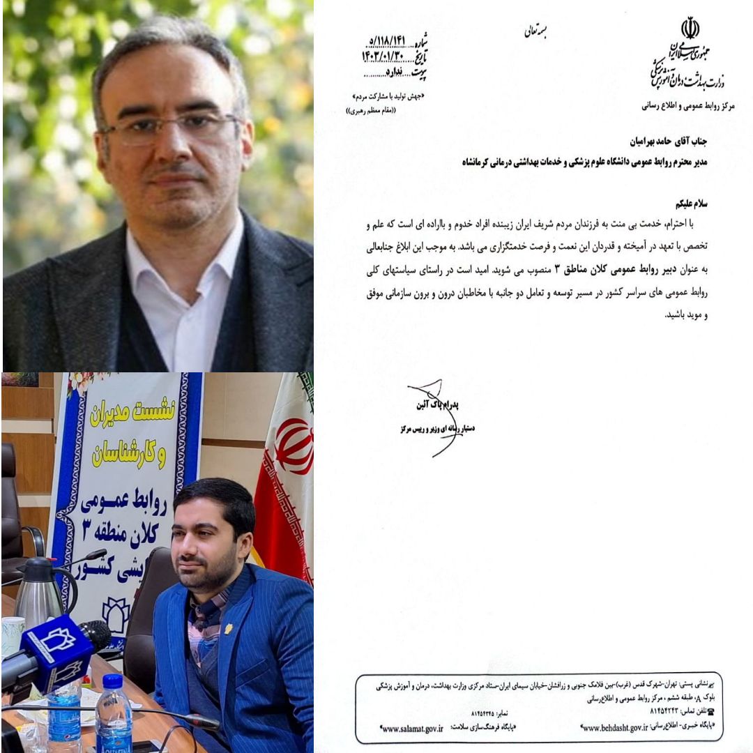 <div><br> </div> <div> طی ابلاغی از سوی پدرام پاک آئین رئیس مرکز روابط عمومی و اطلاع رسانی وزارت بهداشت ، درمان و آموزش پزشکی <span></span><span>حامد بهرامیان مدیر روابط عمومی دانشگاه علوم پزشکی کرمانشاه </span><span>به عنوان دبیر روابط عمومی کلان منطقه ۳ کشور منصوب گردید.</span></div> <div><br> </div> <div><br> </div>