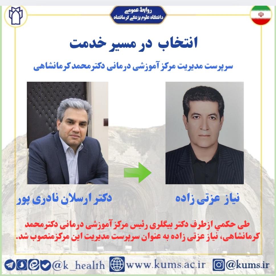 طی حکمی ازطرف دکتر بیگلری رئیس مرکز آموزشی درمانی دکترمحمد کرمانشاهی، نیاز عزتی زاده به عنوان سرپرست مدیریت این مرکز منصوب شد.